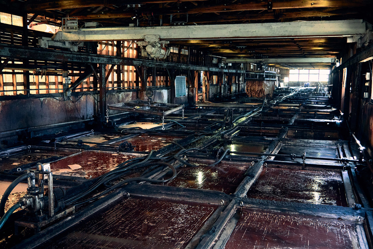 「タンニンなめし」は太古の昔から行われていた伝統的な方法で、ミモザやチェスナットといった植物の樹皮から抽出したタンニン(渋)を含む溶液に、濃度の薄い槽から高い槽へと約2ヶ月かけてじっくりと漬け込みます。手間も時間もかかる上に広大な敷地を要するため、国内では数少ない製法となってしまいましたが、原皮に負担をかけず肌目から芯までタンニンの成分が浸透するため、出来上がった革は収縮が少なく堅牢で、使うほどに馴染んで深い色合いに変化していくのが特徴です。